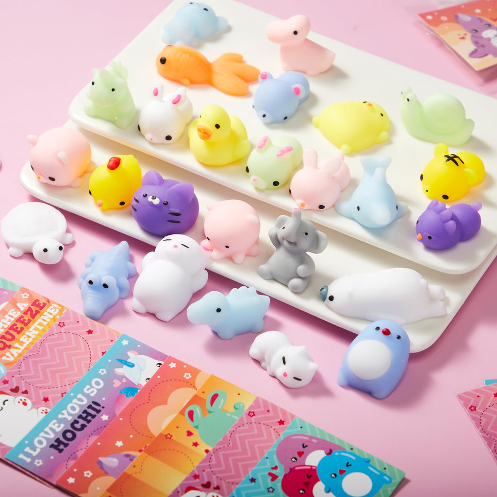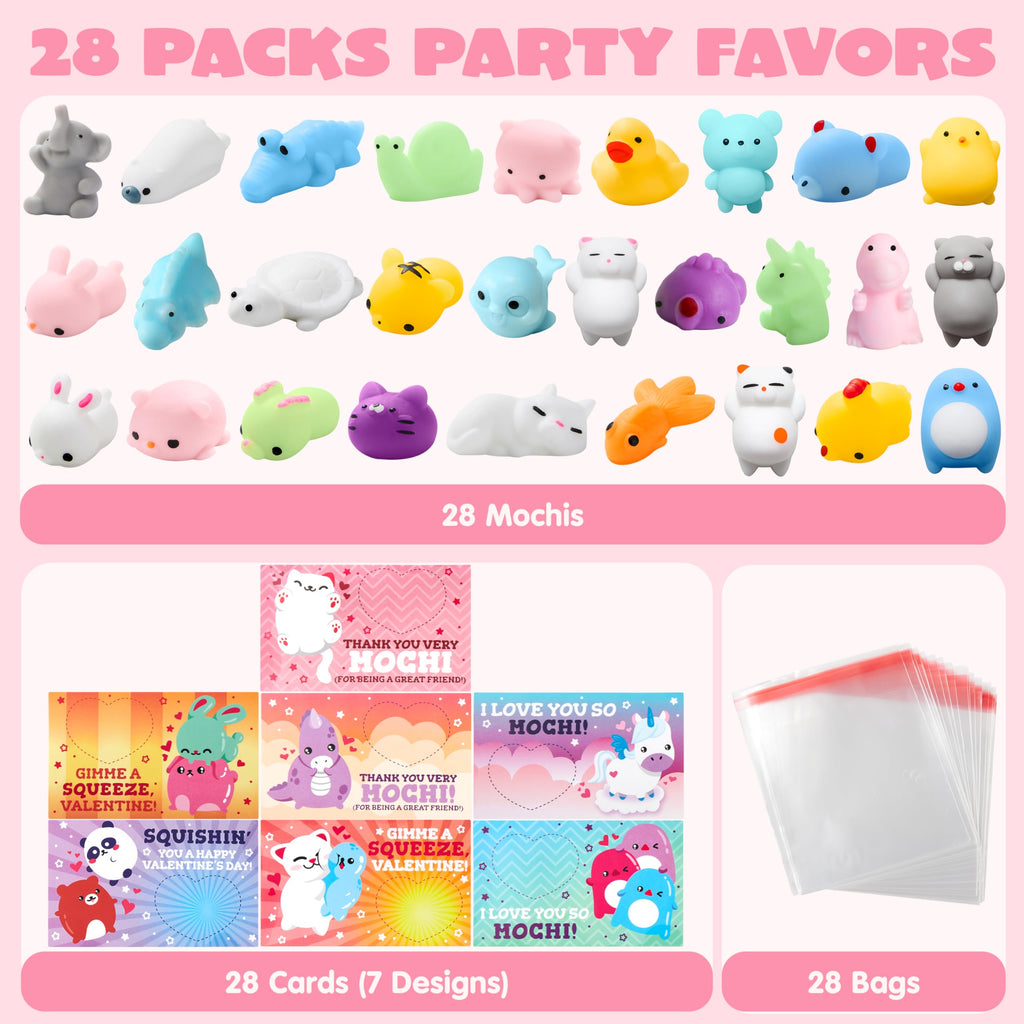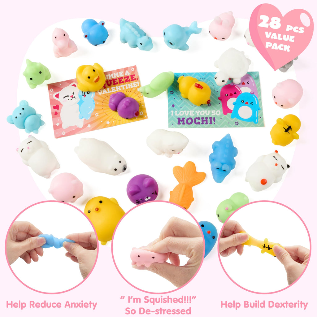 JOYIN 28 Packs Valentines Day Mochi Squishy Toy Stress Relief Gift Cards for Kids