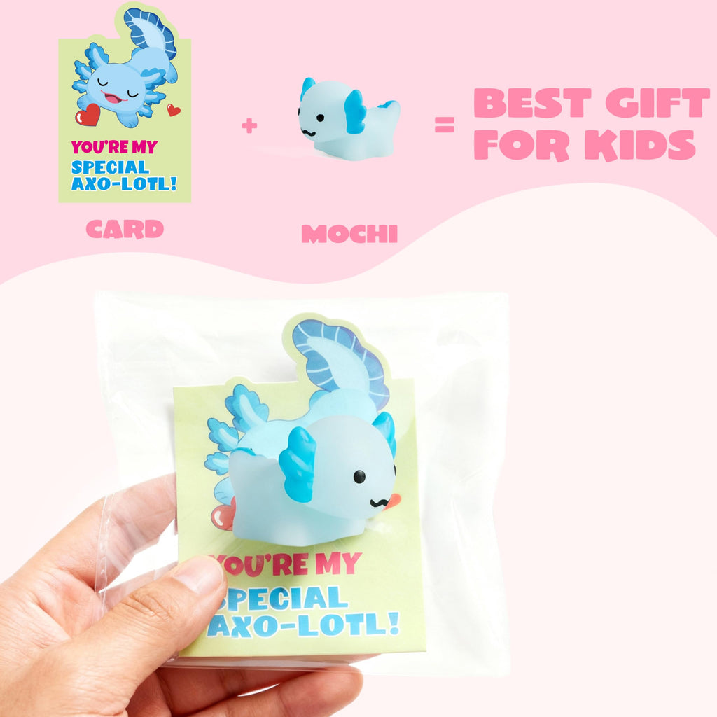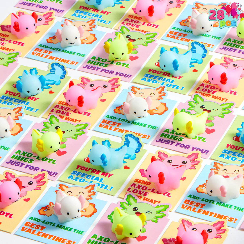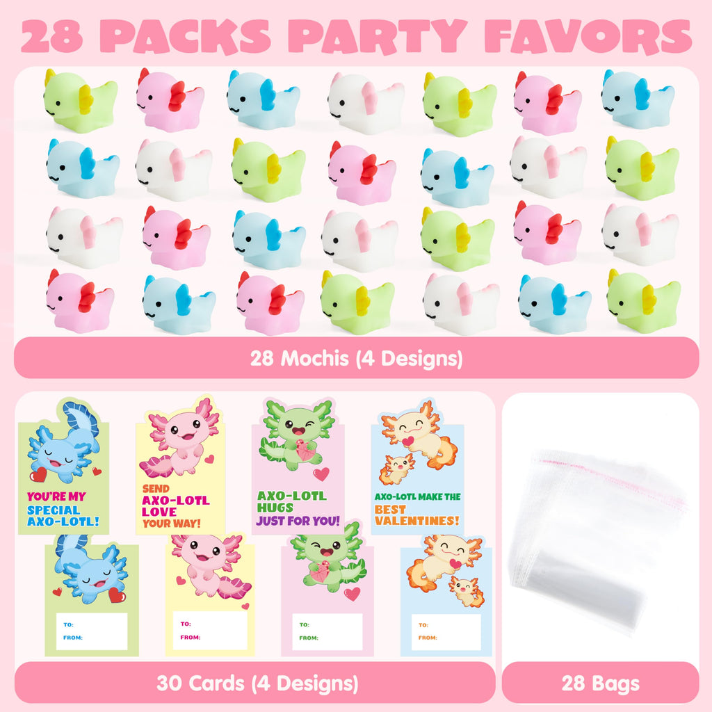 JOYIN 28 Packs Valentines Style Axolotl Mochi Squishy Toy with Funny Valentines Day Cards for Kids