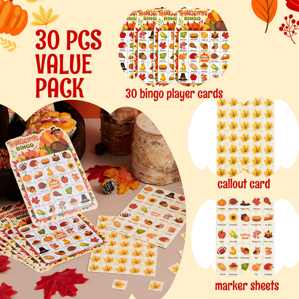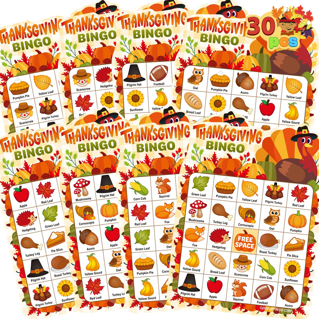 30 PCS Thanksgiving Bingo Game Cards for Kids Family Activities