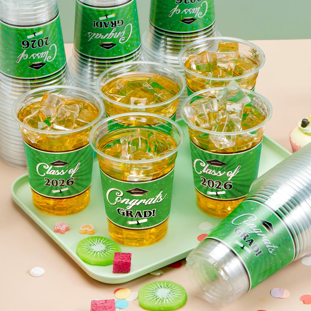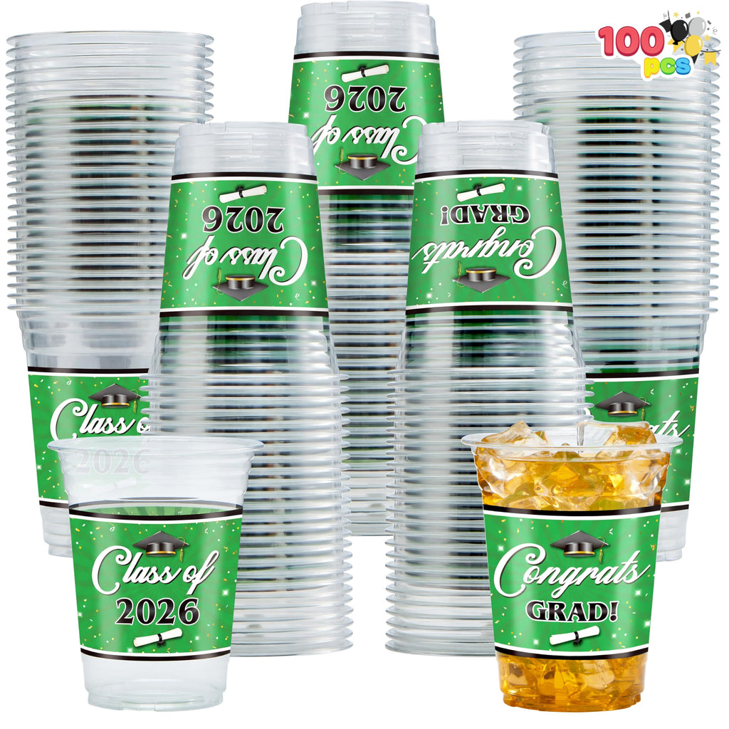 100Pcs 16oz Green Disposable PET Graduation Cups Class of 2026 Party Supplies