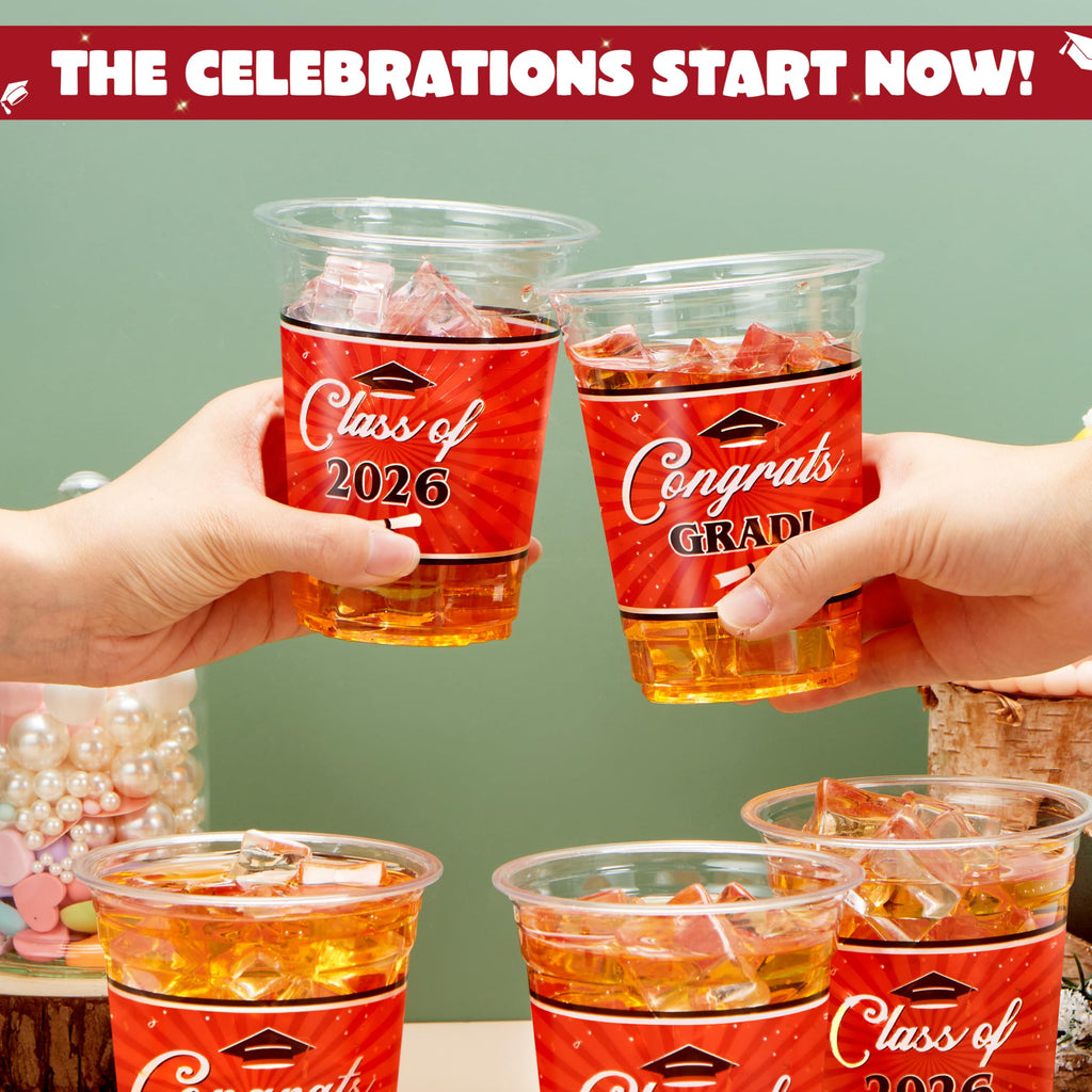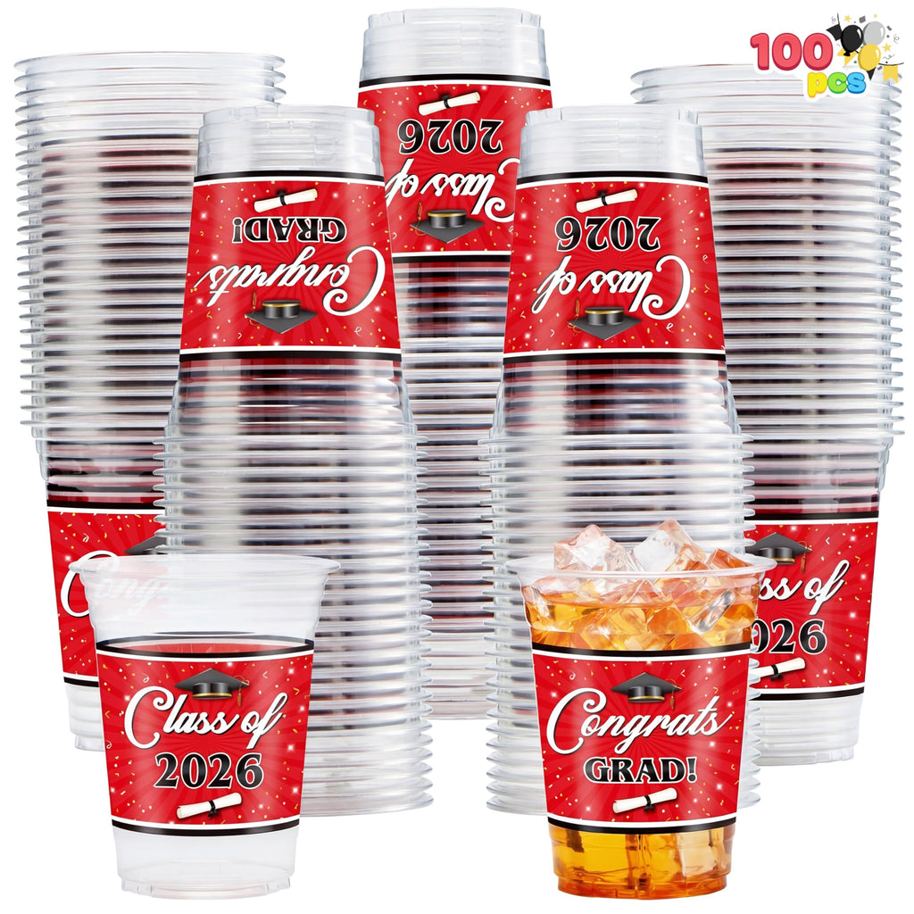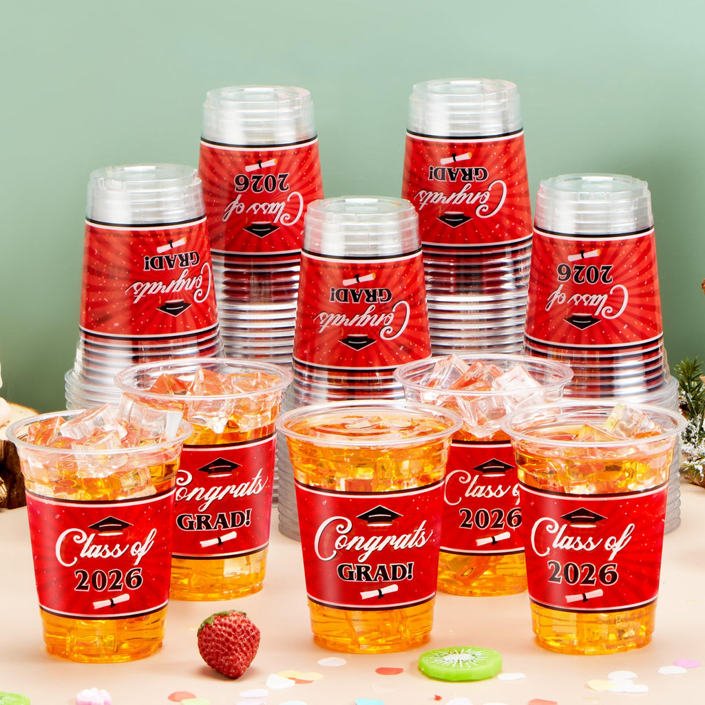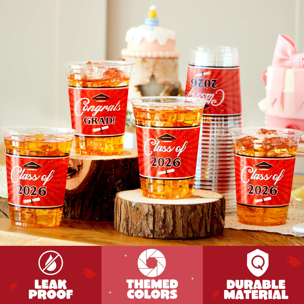 100Pcs 16oz Red Disposable PET Graduation Cups Class of 2026 Party Supplies