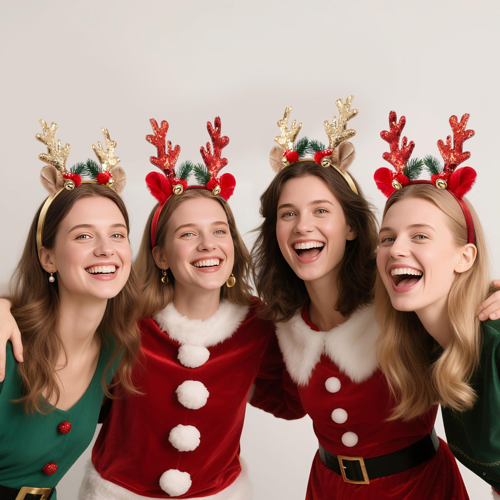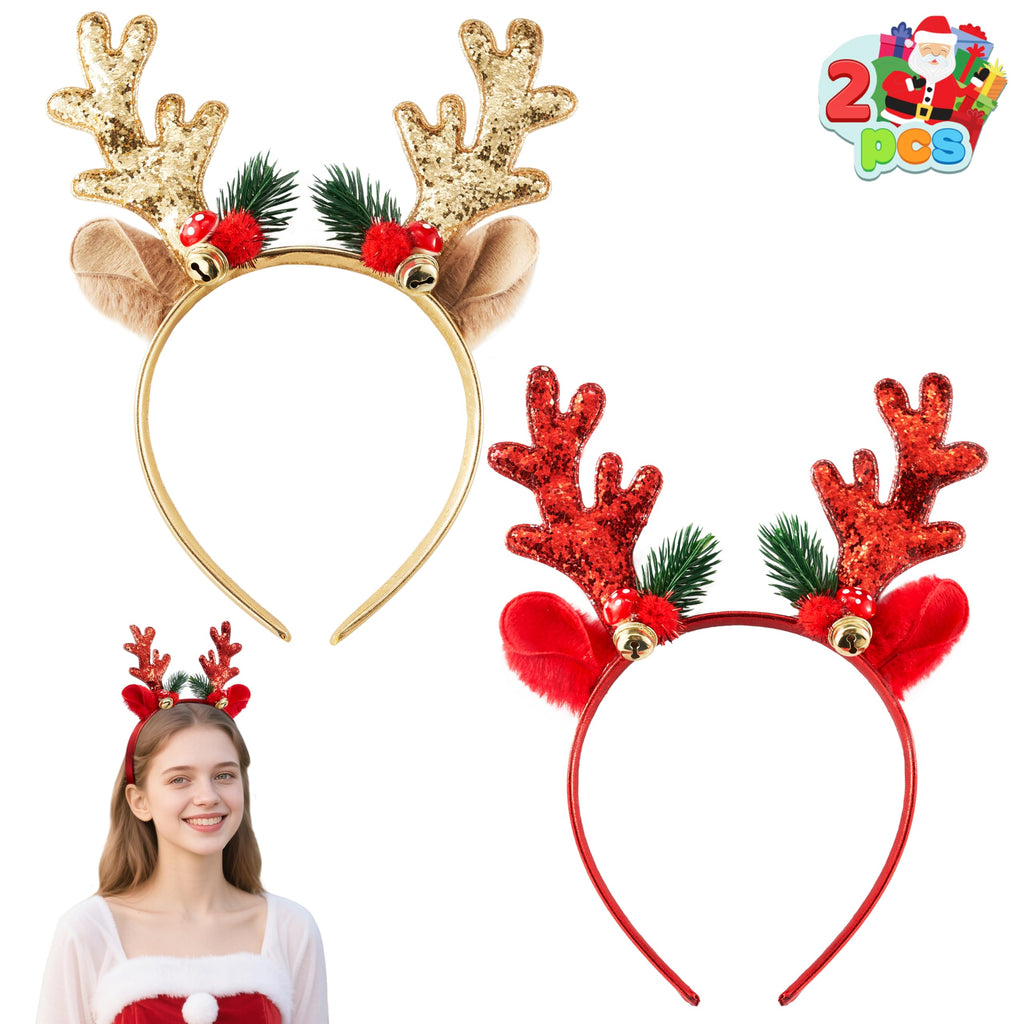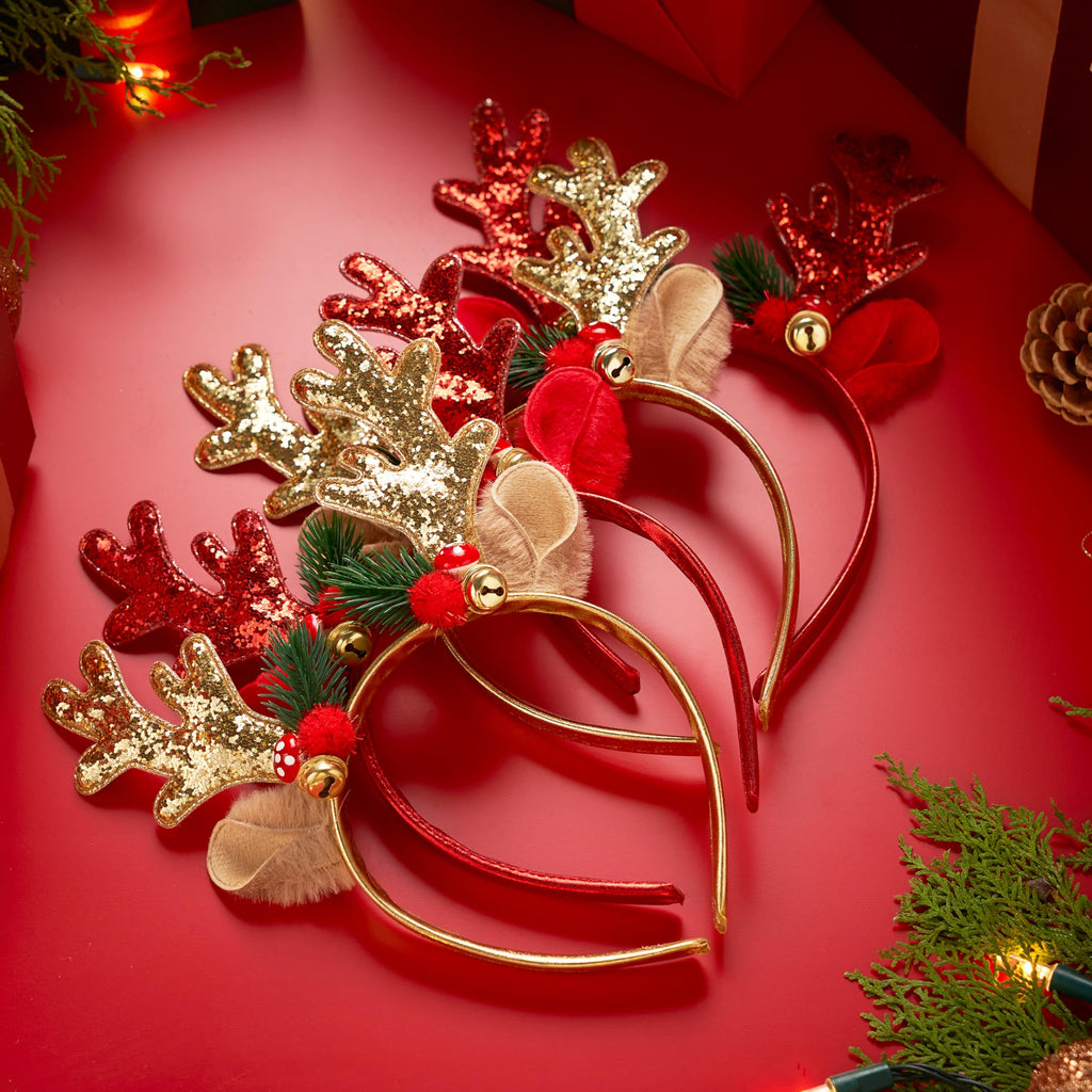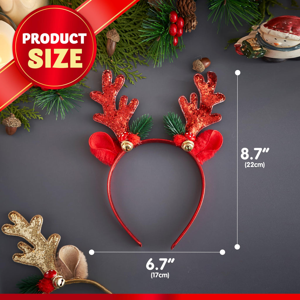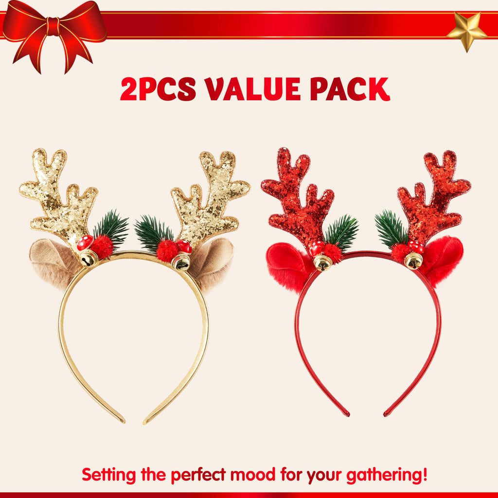 2 Pcs Golden & Red Reindeer Headbands with Glitters